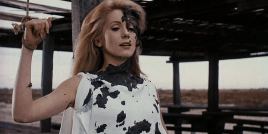 Or perhaps the explosive visions aren’t so explosive after all. Perhaps they’re actually just as anodyne and chilly and washed-out as the rest of the film, and perhaps that’s the point. The text begins with a mock classicist sketch, in which the main couple ride through an autumnal setting in Victorian garb, dressed up in prim and proper bonafides. Suddenly, the moment morphs into a decidedly mechanical account of sexual frustration, an emergent erotic violence that feels like clockwork more than animal id. So much so that the blasé narration intimating that this is some sort of dream or fantasy feels less invasive than natural to the rhythms of the dream. The energy we’re supposed to feel, bare reality erupting through its Victorian cage, feels all the more artificial, all the more part of this cage. This desire to return to history as an escape from the present seems to fit so cleanly into a distinctly modern worldview. It implies that bourgeois modernity, so easily sliding into this repressed history’s fold, is itself part of the frustrated desire that the dream imagines. The 20th century, like the 18th, is a dream that is as repressive as it is liberatory for the film. The banality of it all channels into Catherine Deneuve’s icy, fiendishly interiorized performance, and it renders the bourgeois trappings of modern France decidedly, diabolically artificial, desperately in need of the shock that would come the ensuing calendar year.