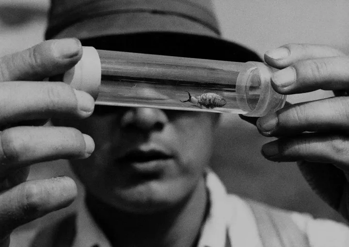 Woman in the Dunes is the story of matter’s murmur, how it promises and then profanes. An unnamed entomologist (Eji Okada) opens the film wandering the coastal desert dunes of a seemingly out-of-the-way corner of Japan, far from his daily life in the doldrums of Tokyo’s burgeoning modernity. For the entomologist, the dunes promise relief from the workaday banality of modern city life, promising challenges to pursue, forces to explore, submit to, and command. He hopes they will unsettle him, that the romantic pull of the sublime otherness of these forbidding desert dunes will sink into his soul, that they will bring him outside himself and thereby return him to himself after communing with the world. But the film slowly impresses on us that his quest is a dangerously abstract escapade, one that takes him away from modernity’s tensions rather than into their conundrums. The titular dunes, with their eerie, eons-long omnipresence, their mixture of grace and gloom, lay his solipsism bare, drowning his ego in forces he wants to both dwarf and that he wants to dwarf him. The titular dunes are iridescence embodied, warping any meaning imposed on them. Alternately confessional stall, open-air penitentiary, and vast abundance, they can stand for seemingly anything and thus, perhaps, afford nothing other than a cosmic trick. The dunes offer this man his soul renewed before holding a mirror up to his inner cravings that he would rather not see. Woman in the Dunes understands that the line between spiritual purgative – hope for cosmic salvation – and menacing infinity – adriftness in a void of your own making – is gossamer thin.
